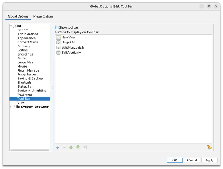 I went ahead and enabled the Tool Bar again to have access to the split view buttons. At the same time, I don't want my GUI to be cluttered. So I disabled the search bar. Accordingly, I was searching for the commands/macros I can add to the Tool Bar. And the new gray arrows don't seem to show in the selection menu.