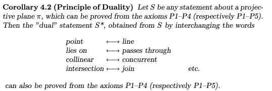 for all projective planes, then so is the dual statement.Hartshorne's little book about projective geometry says it like this
