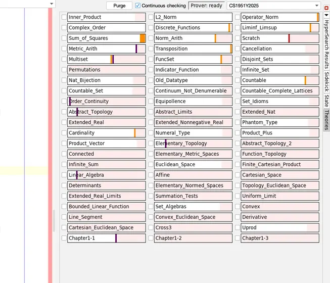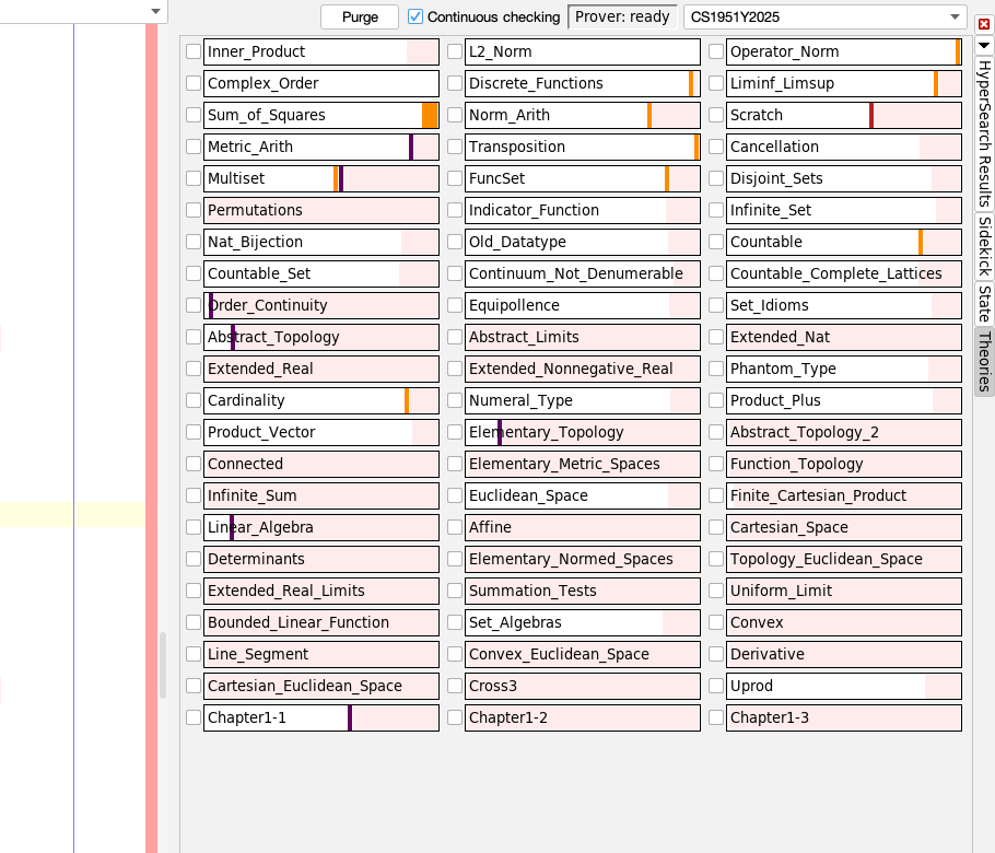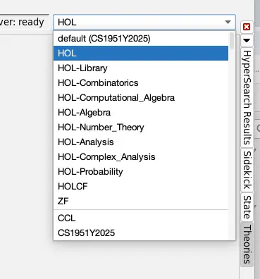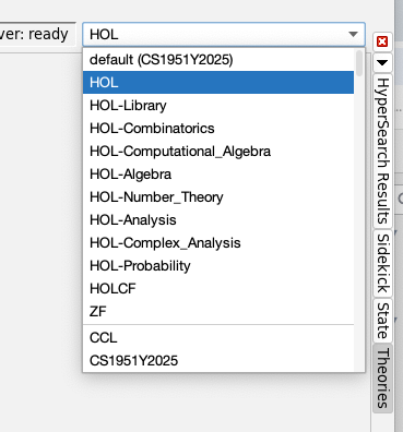 I can load a theory that depends on Chapter1-3.thy and it happens almost instantly. So this seems like a success so far. But if I run Isabelle in the "normal" way (using SpotLight search), CS1951Y2025 is no longer listed in the Theories panel, and loading is once again slow.