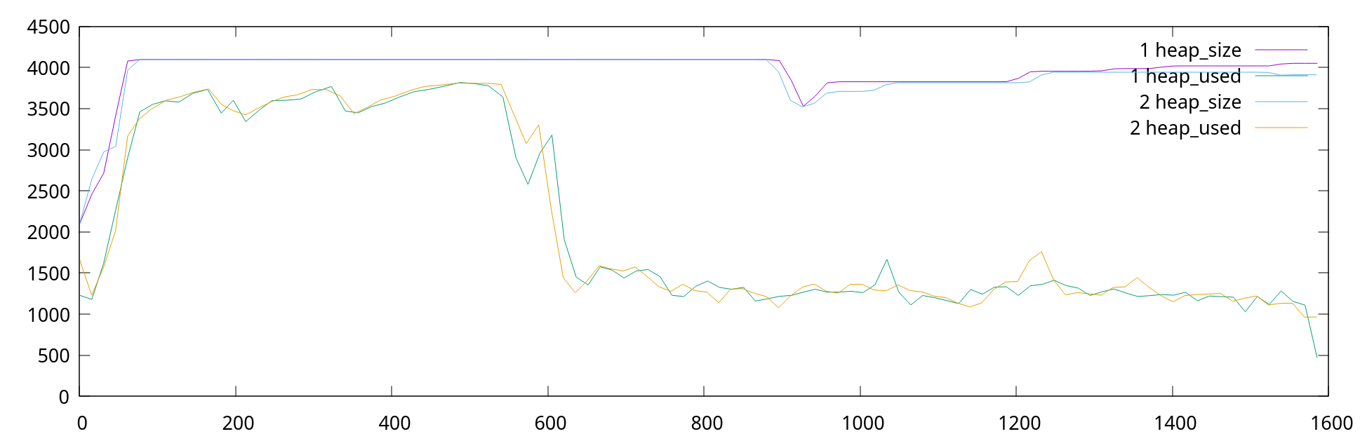 '1.dat' using 1:3 smooth sbezier title "1 heap_used" noenhanced, '2.dat' using